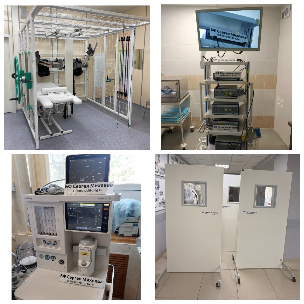 БФ Сергея Михеева передал военным госпиталям: 1 реабилитационный экзоскелетный комплекс, 1 анализатор автоматический иммунохемилюминесцентный с принадлежностями, 1 наркозно-дыхательный аппарат, 1 устройство автоматизированной сушки и хранения гибких эндоскопов, 1 назофаринголарингоскоп, 1 интраоральный сканер, 1 авторефкератометр с принадлежностями, 1 аппарат для динамической электронейростимуляции, 1 аппарат для СМВ терапии импульсный, 1 систему рентгеновскую стоматологическую интраоральную, 1 аудиометр, 1 аппарат для электротерапии и электрофореза, 1 морозильник медицинский, 1 систему мониторинга физиологических показателей, 8 риноскопов, 1 систему визуализации интраоральную, 1 ноутбук для интраорального сканера, 2 аппарата для высокочастотной магнитотерапии, 1 аппарат ультразвуковой терапии, 4 аппарата для УВЧ-терапии, 1 аппарат электрохирургический высокочастотный медицинский, 1 аппарат электросонтерапии, 1 аппарат для гальванизации и электрофореза, 2 облучателя, 4 ширмы, 9 кроватей медицинских, 1 стол медицинский из нержавеющей стали, 3 ингалятора компрессорных, 1 часы процедурные, 100 медицинских лотков, наборы инструментов, лекарства, расходные материалы и другое оборудование.